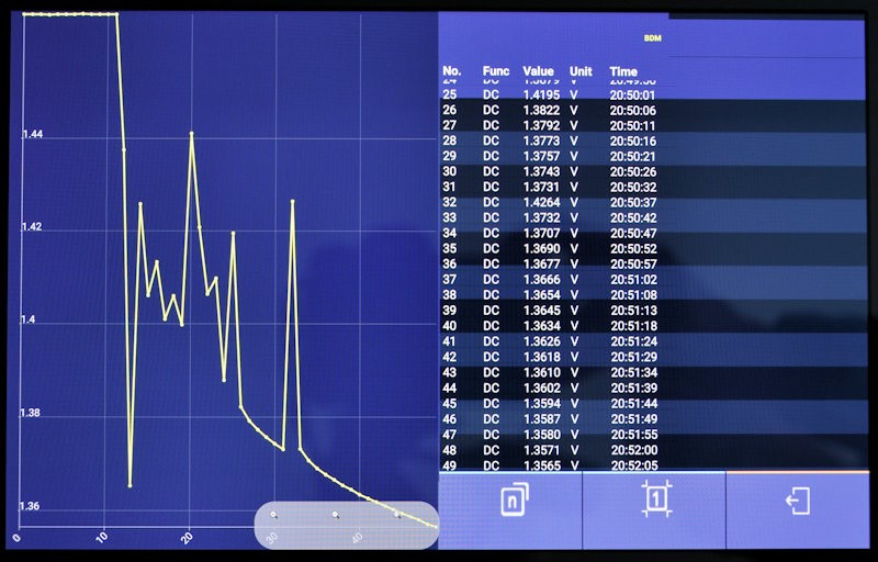 К сожалению, приложение работает только в т.н. «ландшафтном режиме» и по умолчанию формирует экранное изображение для 2-х приборов, при том, что большинство пользователей имеют или будут иметь только один прибор в своём распоряжении. Нужно отметить, что приложение работает очень плавно, соединение стабильно и данные быстро передаются от прибора на функционал приложения. Такое беспроводное соединение очень полезно в том случае, если вы не можете или не хотите постоянно сидеть возле своего прибора, следя за генерируемыми показаниями. Информация, содержащаяся в передающем данные приложении, ничуть не отличается от той, что на экране прибора. Описываемый прибор с прикладным ПО предлагает очень хорошую альтернативу ранее популярному приложению Mooshimeter.
