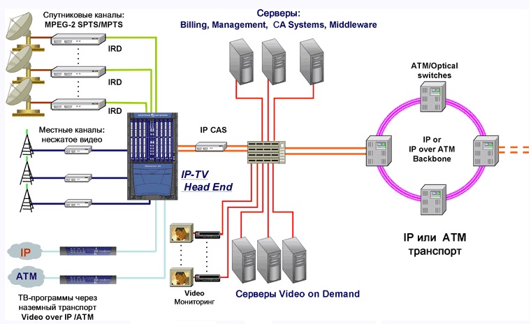 • Сама сеть, представляющая собой транспортный механизм, доставляющий ТВ контент и интерактивные сервисы от Головного узла до домашнего кинотеатра абонента;
