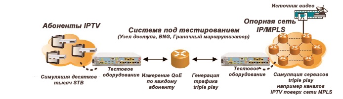 Посредством одновременного эмулирования и масштабирования разнообразных протоколов через унифицированные тестовые порты, такие как PPPoE (Point to Point Protocol over Ethernet), DHCP (Dynamic Host Configuration Protocol) и IGMP (Internet Group Multicast Protocol), происходит создание и последующая симуляция реалистической и эффективной с точки зрения затрат среды тестирования, способной предложить алгоритмы повышения качества трансляции сервисных приложений triple play, что напрямую соответствует растущим ожиданиям абонентов IPTV. Тестовая система должна быть способной эмулировать и проводить измерения на широко развёрнутой инфраструктуре, обслуживающей десятки тысяч абонентов, смотрящих сотни различных каналов, предоставляемых не отдельно взятым, а несколькими узлами сети IPTV.