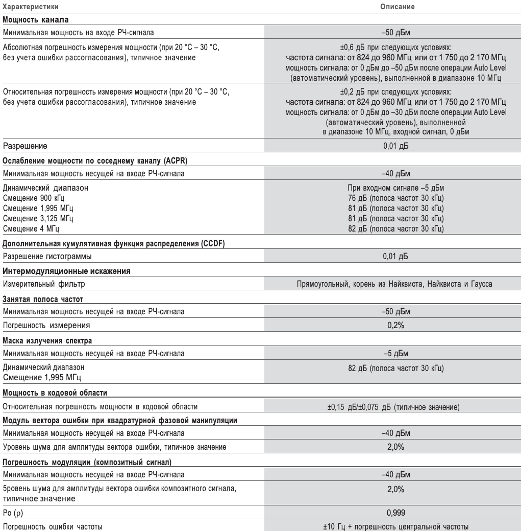 Bыполнение основных измерений для 3GPP TS34.121, включая возможности анализа PRACH. Поддерживает следующие измерения – «созвездие», амплитуда вектора ошибки, «глазковая» диаграмма, таблица символов, спектрограмма CDP, CDP по отношению к сокращенному коду, CDP по отношению к символу, CDP по отношению к временному интервалу, «созвездие» для символов, амплитуда вектора ошибки для символов, «глазковая» диаграмма для символов. Поддерживает сигналы восходящего канала связи W-CDMA – DPDCH 9, выделенный канал физических данных/DPCCH (выделенный канал физической проверки), PRACH (канал физических данных с произвольной выборкой), PCPCH (канал физических общих пакетов).