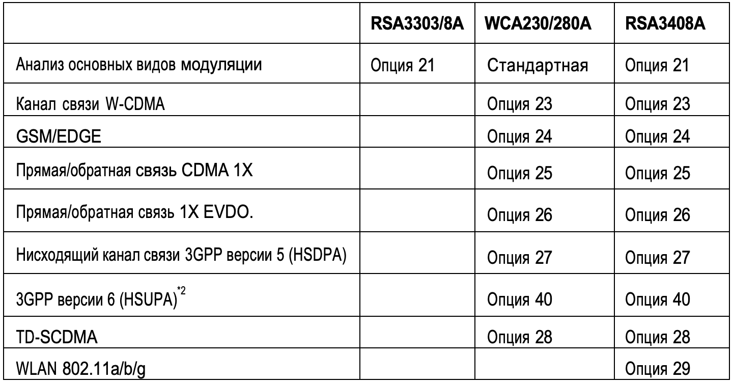 *2 Для анализа сигналов 3GPP версии 6 (HSUPA) опции 23, 27 обязательны наряду с опцией 40
