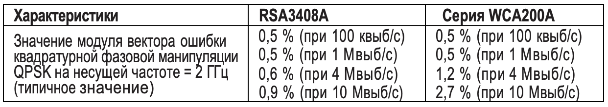 5,3 Мвыб./с, несущая 1 ГГц (диапазон 15 МГц) – Модуль вектора ошибки ≤2,5% (типичные значения).