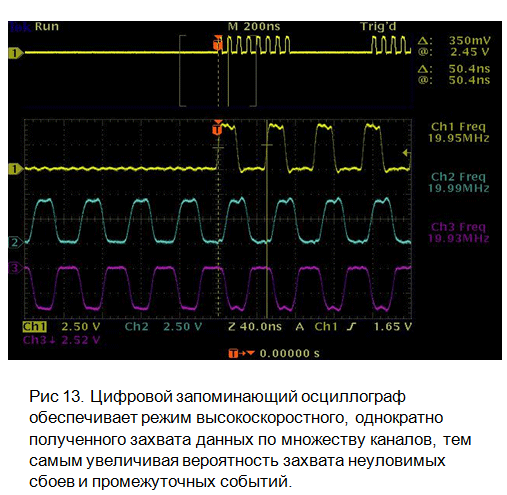 Как это показано на рис. 13, DSO является высокопроизводительным, с режимом однократного захвата многоканальным электронным инструментом. DSO идеальны для применений и разработок, где имеют место повторяющиеся с низкой скоростью или однократные, высокоскоростные по множеству каналов события. В реальном мире цифровых разработок инженеры одновременно анализируют четыре или более сигналов, что делает DSO их важнейшим рабочим «компаньоном».