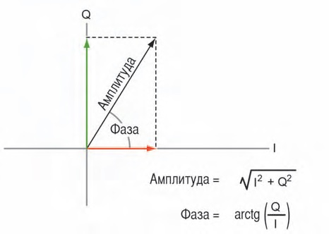 Амплитуду и фазу можно рассматривать как длину и угол поворота вектора в полярной системе координат. Такое же рассмотрение подходит и для Декартовой (прямоугольной) системы координат (X,Y). Формат I/Q выборок по времени, сохраненных в памяти анализатора спектра в реальном масштабе времени, с точки зрения математики эквивалентны декартовым координатам, причем I представляет горизонтальную компоненту (X), а Q — вертикальную компоненту (Y).