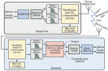 На рис. 2-17 изображена схема обработки сигнала в типичной цифровой системе связи. Процесс передачи начинается с поступления передаваемых данных и тактового сигнала. Данные и тактовый сигнал проходят через шифратор, который переупорядочивает данные, добавляет биты синхронизации, выполняет помехоустойчивое кодирование и шифрование. Затем данные разделяются по трактам I и Q и фильтруются. Таким образом они превращаются в аналоговые сигналы, которые подвергаются преобразованию с повышением частоты до соответствующего канала и передаются в эфир. Между передачей и приемом сигнал неизбежно ухудшается вследствие воздействия окружающей среды.