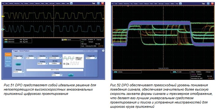 Скорость захвата формы сигнала сильно различается в зависимости от типа и уровня производительности осциллографа. Осциллографы с высокой скоростью захвата формы сигнала обеспечивают значительно лучшее визуальное представление о поведении сигнала и значительно увеличивают вероятность того, что осциллограф быстро обнаружит переходные аномалии, такие как джиттер, кратковременные импульсы, глитчи и ошибки перехода. (См. рис. 51 и 52.)