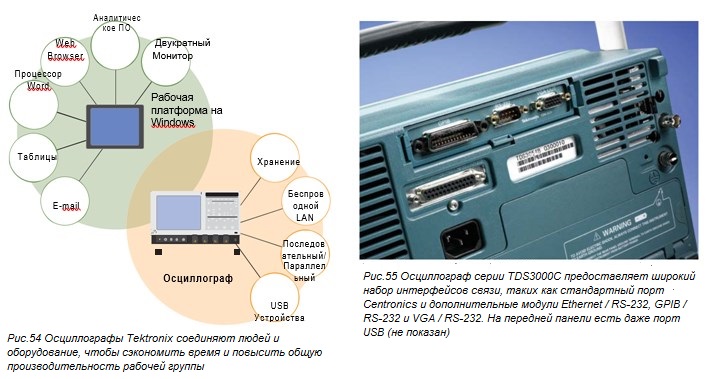 Необходимость анализа результатов измерений остается первостепенной. Также возросла важность легкого и частого документирования с последующей передачи информации и результатов измерений через высокоскоростные сети связи. Варианты подключения осциллографа обеспечивают расширенные возможности анализа и упрощают документирование и обмен результатами. Стандартные интерфейсы (GPIB, RS-232, USB, Ethernet) и сетевые коммуникационные модули позволяют некоторым осциллографам предоставлять широкий спектр функций и управления.