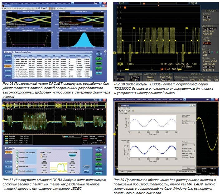 Прикладные модули и программное обеспечение могут позволить вам превратить осциллограф в узкоспециализированный инструмент анализа, способный выполнять такие функции, как анализ джиттера и синхронизации, проверка системы памяти микропроцессора, тестирование стандартов связи, измерения дисковых накопителей, видео измерения, измерения мощности и многое другое.