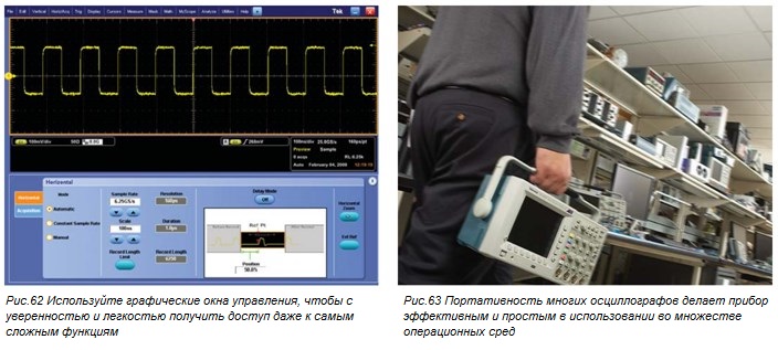 Компоновка передней панели обеспечивает выделенные элементы управления по вертикали, горизонтали и триггеру. Графический пользовательский интерфейс, богатый значками, помогает понять и интуитивно использовать расширенные возможности. Сенсорный дисплей решает проблемы с загроможденными скамейками и тележками, обеспечивая доступ к четким экранным кнопкам. Онлайн справка представляет собой удобное встроенное справочное руководство. Интуитивно понятные элементы управления позволяют даже случайным пользователям осциллографа чувствовать себя за рулем осциллографа так же комфортно, как и за рулем автомобиля, при этом предоставляя постоянным пользователям легкий доступ к наиболее продвинутым функциям осциллографа. Кроме того, многие осциллографы портативны, что делает осциллограф эффективными во многих различных условиях эксплуатации - в лаборатории или в полевых условиях.
