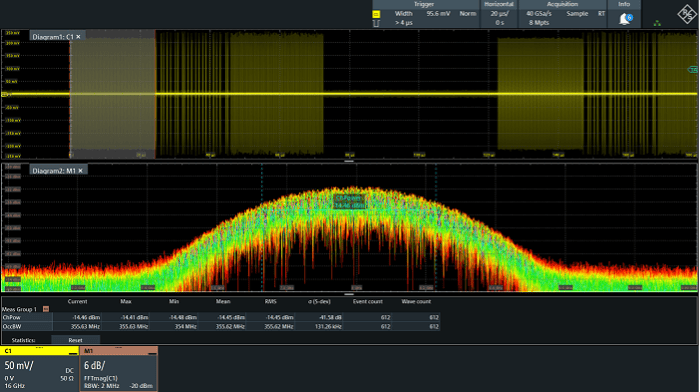 Расширенные осциллографы обычно включают возможности FFT, которые позволяют пользователям сопоставлять сигналы во временной и частотной областях. Например, растущее использование стандарта UWB 802.15.4z в автомобильных приложениях требует одновременного изучения сигналов UWB в обеих областях. Функция стробируемого FFT на осциллографах Rohde & Schwarz предлагает возможность выбора определенной части сигнала во временной области и отображения соответствующего ей спектра. Также возможны спектральные измерения, такие как мощность канала и занимаемая полоса пропускания (см. рис. 4).