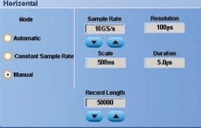 Если вам нужно выполнить точные измерения с максимальной частотой дискретизации, выбирайте режим Постоянной частоты дискретизации. Он обеспечит наилучшее разрешение в реальном времени. Последний режим называется Ручным, поскольку обеспечивает непосредственное и независимое управление частотой дискретизации и длительностью записи.