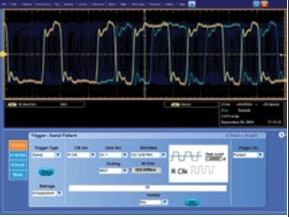Функция запуска по заданной комбинации данных последовательной шины использует опцию запуска для последовательных потоков данных NRZ с системой восстановления встроенной тактовой частоты (доступна только в моделях DPO7254 и DPO7354). Прибор может восстанавливать сигнал тактовой частоты, идентифицировать переходы и декодировать символы и другие данные протокола. Сочетание функции запуска по последовательным данным с ПО декодирования протокола позволяет декодировать захваченные битовые последовательности в слова (для 8/10-битных и других систем последовательного кодирования) или настраивать систему запуска по нужным кодированным словам для захвата некоторого участка последовательных данных. Опция для запуска по последовательным шинам охватывает стандарты NRZ со скоростью передачи до 1,25 Гбит/с
