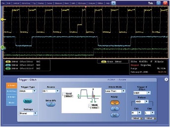 Если вы пытаетесь найти аномалии или хотите локализовать часть сложного сигнала для дальнейшего анализа, например, сигнал чтения или записи шины DDR, то воспользуйтесь системой запуска Pinpoint® компании Tektronix. Постороенная на кремний-германиевой (SiGe) технологии для обеспечения очень высокой чувствительности срабатывания с низким уровнем собственного джиттера система Pinpoint позволяет захватывать глитчи с минимальной длительностью. Возможность настройки запуска по событиям А и В предоставляет практически неограниченные возможности по сравнению с конкурентами, у которых есть возможность запускаться по событию А с отложенным запуском по событию B, причем с ограничением запуска только по фронту. Это в свою очередь не позволяет производить сброс системы запуска в исходное состояние, когда событие B не произошло. Система Pinpoint предоставляет полный набор различных типов запуска по обоим событиям А и В, логическую оценку для контроля времени поиска этих событий и сброс системы запуска после определенного периода времени, состояния или перехода, что дает возможность захвата событий даже в самых сложных сигналах. Другие осциллографы обычно предоставляют менее 20 комбинаций запуска, тогда как система Pinpoint предоставляет более 1400 комбинаций.