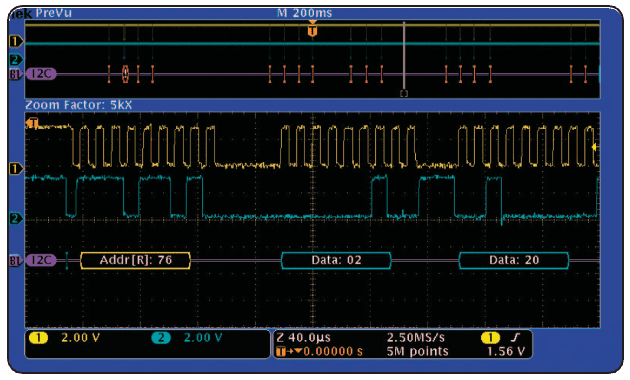 Запуск по конкретному пакету данных, проходящему по шине I2C. Жёлтая осциллограмма — сигнал тактовой частоты, синяя — данные. Осциллограмма шины позволяет отображать содержимое декодированного пакета, в том числе «Старт», «Адрес», «Чтение/Запись», «Данные» и «Стоп».