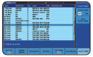 Таблица декодирования пакетов — помимо просмотра декодированных данных пакета непосредственно на осциллограмме сигналов шины можно вывести на экран табличное представление всех захваченных пакетов, так же как в логическом анализаторе. Пакеты имеют отметку времени и организованы в последовательный список со столбцами для каждого компонента (адрес, данные и т. п.).