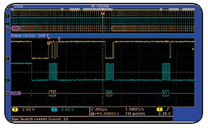 Декодирование шины — вы устали от просмотра осциллограмм и подсчета тактов в попытке установить, какой бит 1, какой — 0, от объединения битов в байты и определения шестнадцатеричного значения? Пусть осциллограф сам сделает это! Осциллограф может декодировать каждый пакет на шине и отображать значение в шестнадцатеричном, двоичном, десятичном коде или коде ASCII (в зависимости от стандарта) на осциллограмме сигналов шины.