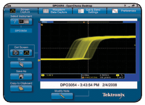 Осциллографы серии DPO3000 обеспечивают беспрецедентно новый уровень работы с ПК и подключения к нему через интерфейс USB с использованием технологии plug-and-play. Порт USB на передней панели предоставляет возможность простого переноса снимков экрана, настроек прибора и осциллограмм буквально на ладонь вашей руки. Кроме того, на задней панели прибора имеется второй хост-порт USB, который наряду с портом USB передней панели может работать в качестве порта USBTMC для дистанционного управления осциллографом с компьютера. Встроенный порт 10/100 Ethernet позволяет легко подсоединиться к информационным сетям. Для вывода собранных данных и результатов измерений достаточно подсоединить осциллограф к ПК USB-кабелем. В число поставляемых приложений входят NI LabVIEW SignalExpress™ Tektronix Edition, OpenChoice® Desktop, а также панели инструментов Microsoft Excel и Word, позволяющие быстро и просто устанавливать прямую связь с компьютером, работающим под управлением Windows.