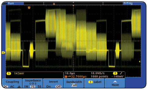 Многие разработчики видеотехники до сих пор остаются верны аналоговым осциллографам, считая, что только градации интенсивности свечения аналогового экрана позволяют разглядеть некоторые детали осциллограмм видеосигналов. Высокая скорость захвата сигналов осциллографов серии DPO3000 при наличии возможности отображения осциллограмм с градациями яркости позволяет получить такое же насыщенное информацией изображение, как и аналоговый осциллограф, но значительно более детализированное. Вместе с тем приборы обладают всеми преимуществами цифровых осциллографов. Имея полосу пропускания до 500 ГГц, четыре канала и встроенную входную нагрузку 75 Ом, осциллографы семейства DPO3000 обеспечивают вполне достаточное быстродействие для применения при разработке аналоговой и цифровой видеотехники.
