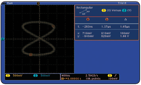 Двухмерное (XY) отображение, показывающее синхроимпульс с частотой 20 МГц и синхроимпульс с частотой 10 МГц.