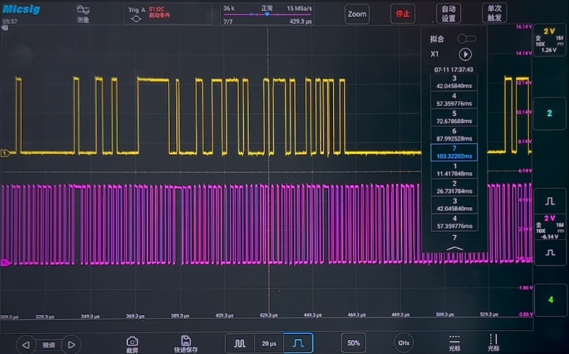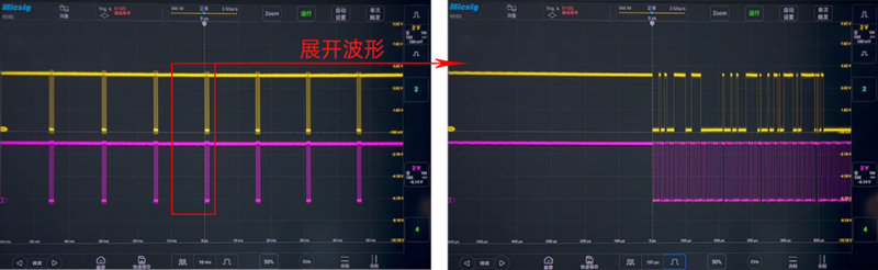 Рисунок выше — это сигнал шины I2C, измеренный 12-битным осциллографом высокого разрешения Micsig MHO3-5004, где расширенная форма сигнала показывает серию импульсов.