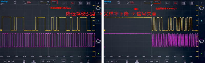 Мы изменяем временную базу на 10 мс и устанавливаем глубину памяти на 36 кбит/с, при этом частота дискретизации в это время составляет 300 квыб/с (правый рисунок выше). Мы останавливаемся и расширяем, чтобы наблюдать за формой сигнала, и можно увидеть, что исходный прямоугольный сигнал полностью искажен. Причина в уменьшении глубины памяти, что приводит к снижению частоты дискретизации. Поэтому осциллограф с большой глубиной памяти может гарантировать, что даже при записи сигналов в течение длительного времени сигнал не будет искажен.
