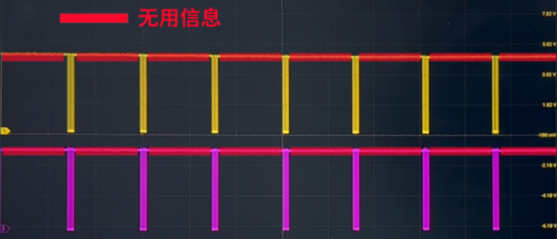 Давайте снова посмотрим на этот сигнал шины I2C, отметив, что большая часть фактического сигнала представляет собой бесполезную информацию. То, что нам действительно нужно увидеть, — это лишь небольшая часть всего цикла. Итак, можем ли мы позволить осциллографу Micsig записывать только полезный сегмент и не записывать бесполезный сегмент, тем самым экономя много памяти и смягчая или даже решая проблему искажения сигнала? Эта функция фактически является сегментированным хранилищем.