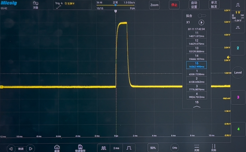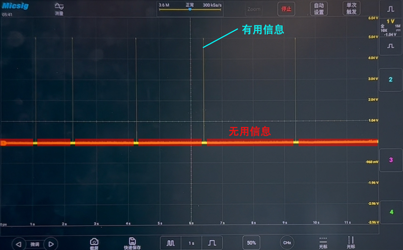 Если вы используете функцию сегментированного хранения 12-битного осциллографа высокого разрешения Micsig MHO3-5004, эта проблема не существует. Предположим, мы хотим захватить 15 сегментов таких сигналов, просто установите количество сегментов 15 в сегментированном хранилище, установите соответствующий режим запуска и нажмите на одиночный запуск. Осциллограф покажет общее количество сегментов, которые необходимо захватить, и количество сегментов, которые были захвачены. После завершения захвата осциллограф остановится и отобразит внешний вид каждого сегмента сигнала, что очень полезно для захвата нескольких экземпляров случайных сигналов.