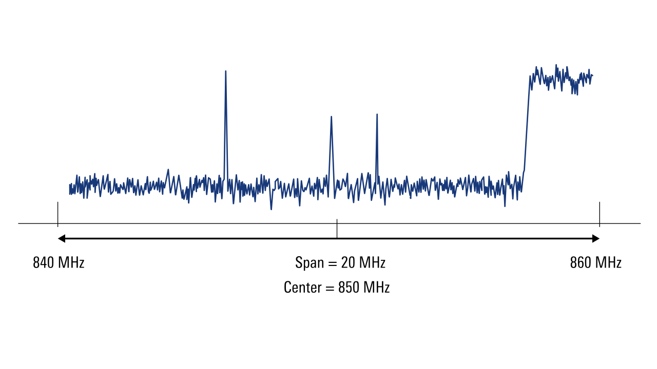 Например, для измерения мощности в диапазоне частот от 840 до 860 МГц. Эти значения можно ввести в анализатор спектра как начальную и конечную частоты, но чаще используются центральная и полоса обзора. Названия говорят сами за себя: центральная частота — это частота в середине экрана, а полоса обзора — это ширина экрана. Диапазон от 840 до 860 МГц соответствует центральной частоте 850 МГц и полосе обзора 20 МГц. Чаще всего центральная частота исследуемого сигнала известна, и с помощью полосы обзора проще увеличивать и уменьшать масштаб, просто увеличивая или уменьшая полосу обзора.