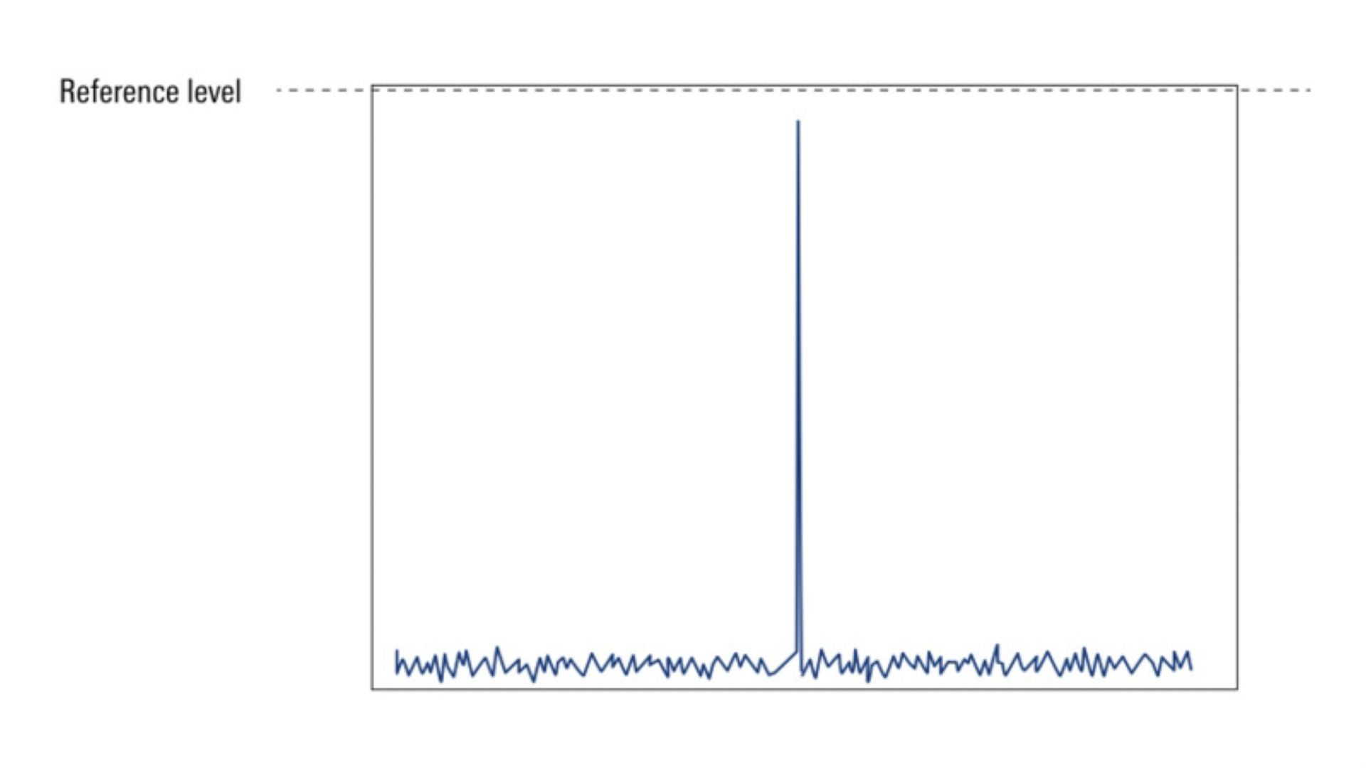 Опорный уровень находится на верхнем краю экрана и соответствует максимальной ожидаемой мощности на входе анализатора спектра. В большинстве случаев опорный уровень настраивается таким образом, чтобы максимальный уровень сигнала был немного ниже этого уровня.