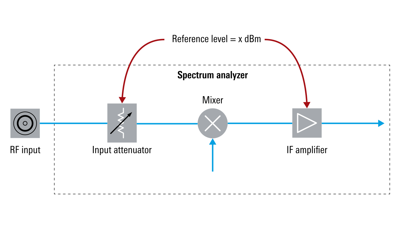 После ВЧ-входа, некоторые из первых секций анализатора спектра включают активные компоненты, такие как смесители и усилители. При слишком высоком уровне входного сигнала эти устройства могут войти в компрессию, что приводит к искажениям и отрицательно влияет на результаты измерений, иногда весьма существенно. Чтобы предотвратить это, между ВЧ-входом и этими чувствительными компонентами устанавливается регулируемый входной аттенюатор. После установки опорного уровня это значение используется анализатором спектра для регулировки входного ослабления и/или усиления усилителя ПЧ, чтобы избежать перегрузки прибора.