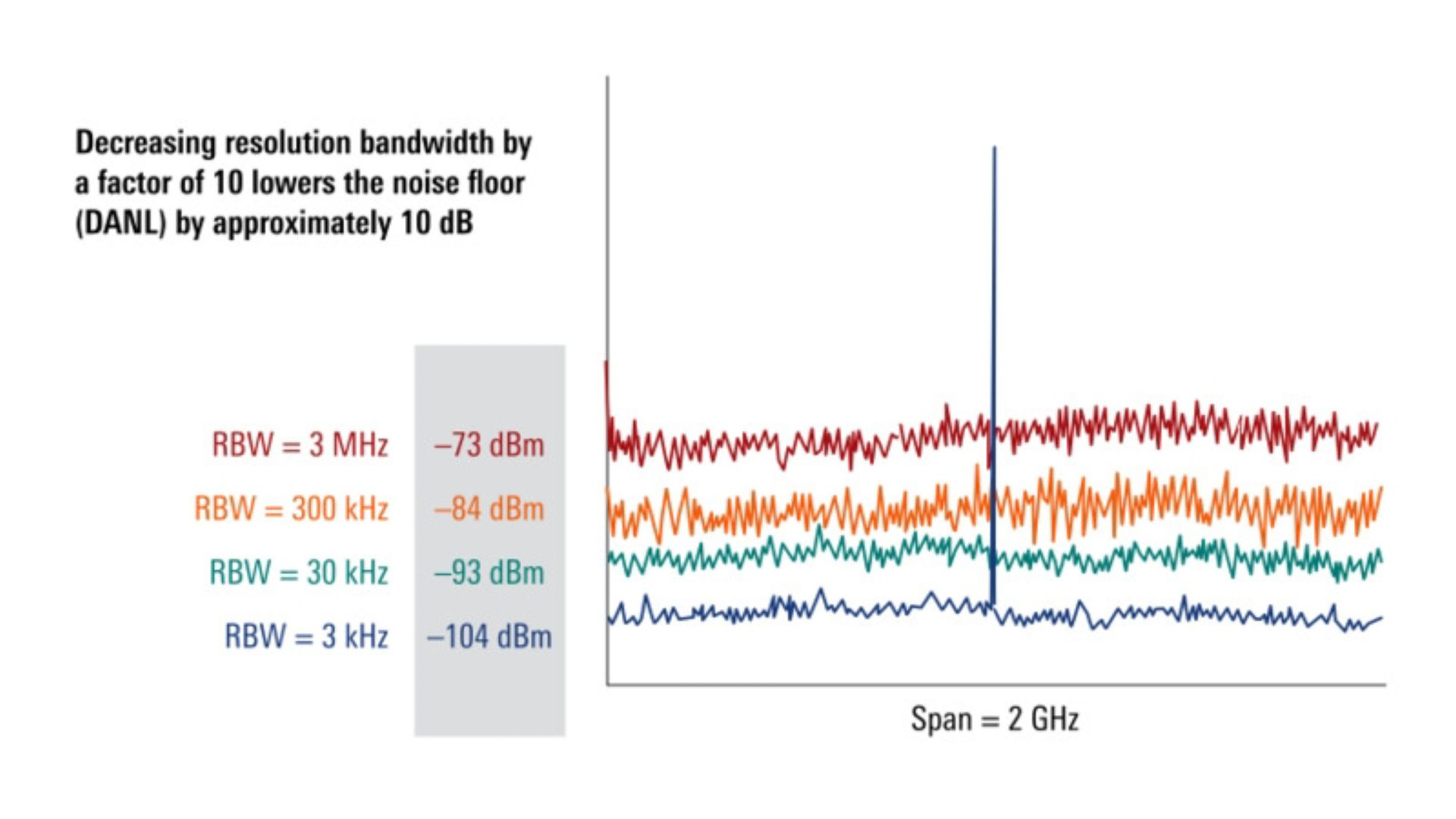 Другим аспектом полосы разрешения является её влияние на уровень шума. Более конкретно, полоса разрешения влияет на уровень шума, также называемый средним уровнем шума (DANL). Уровень шума увеличивается или уменьшается в зависимости от выбранной полосы разрешения.