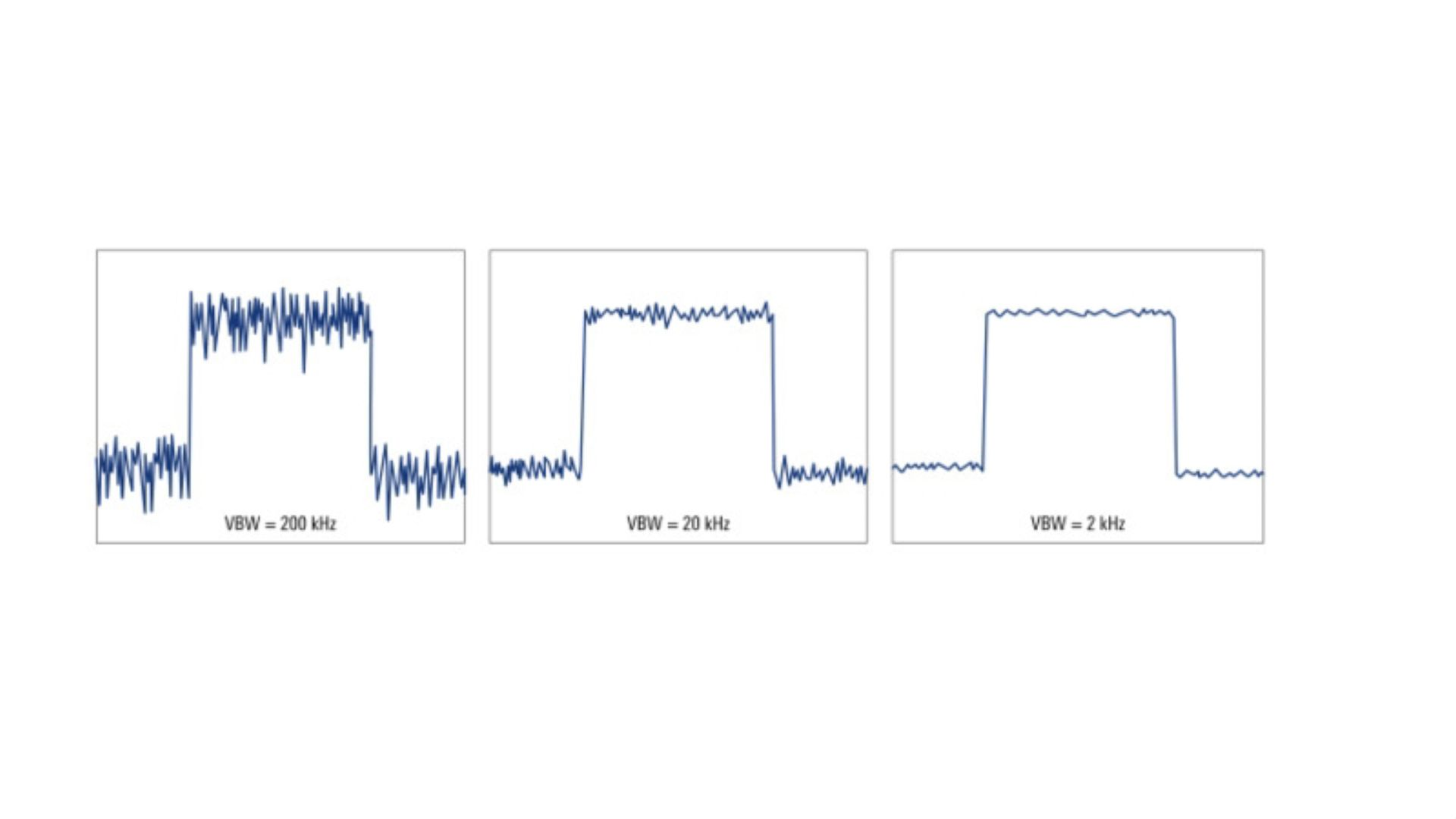 При уменьшении видеополосы до 200 кГц в сигнале можно заметить изрядное количество шума. Этот шум уменьшается при уменьшении видеополосы до 20 кГц и ещё больше при уменьшении до 2 кГц. Уменьшение видеополосы уменьшает только шум на трассе, но не снижает уровень шума, как это происходит при уменьшении полосы разрешения. Кроме того, это не улучшает способность различать или разделять близкие сигналы.