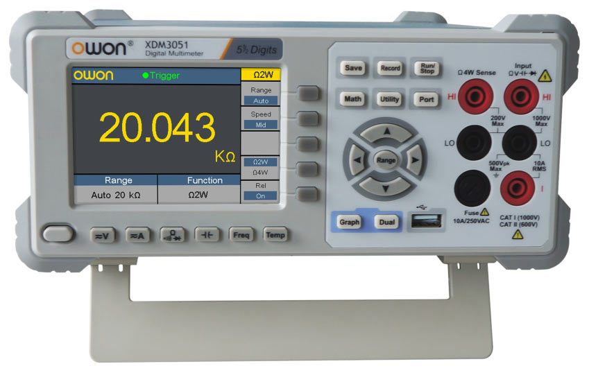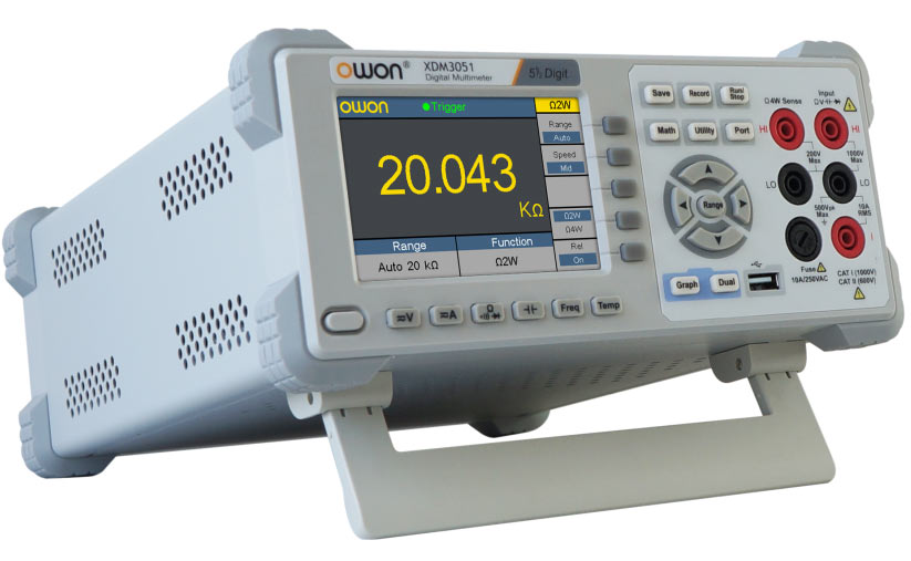 Прецизійний мультиметр xDS3051 має високу точність вимірювань (базова похибка: 0,015%), призначений для вимірювання напруги AC / DC, струму AC / DC, опору, ємності, частоти / періоду, температури, проведення тестування діодів і перевірки на провідність. Вимірювання опору виконується як по 2-х провідний, так і 4-х провідній схемі виключає опір пробників. Мультиметр OWON xDM3051 володіє високою швидкодією забезпечує 150 вимірювань в сек. Для коректного вимірювання змінного струму і напруги реалізована функція вимірювання діючого середньоквадратичного значення - TrueRMS, що важливо для виконання достовірних вимірювань в ланцюгах з нелінійним навантаженням.