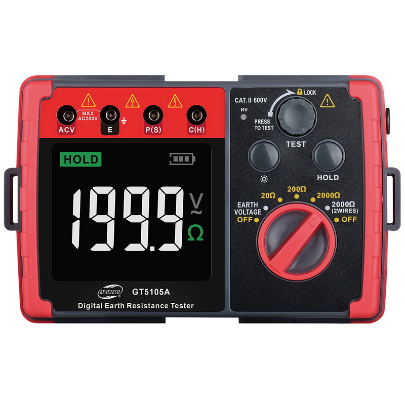 GT5105A – измеритель сопротивления заземления до 2000 Ом. Это компактный измерительный прибор, позволяющий с высокой точностью производить измерения сопротивления заземления в трех диапазонах: 20 Ом, 200 Ом и 2000 Ом. Помимо этого, прибор имеет возможность измерения напряжения заземления переменного тока до 200 В.