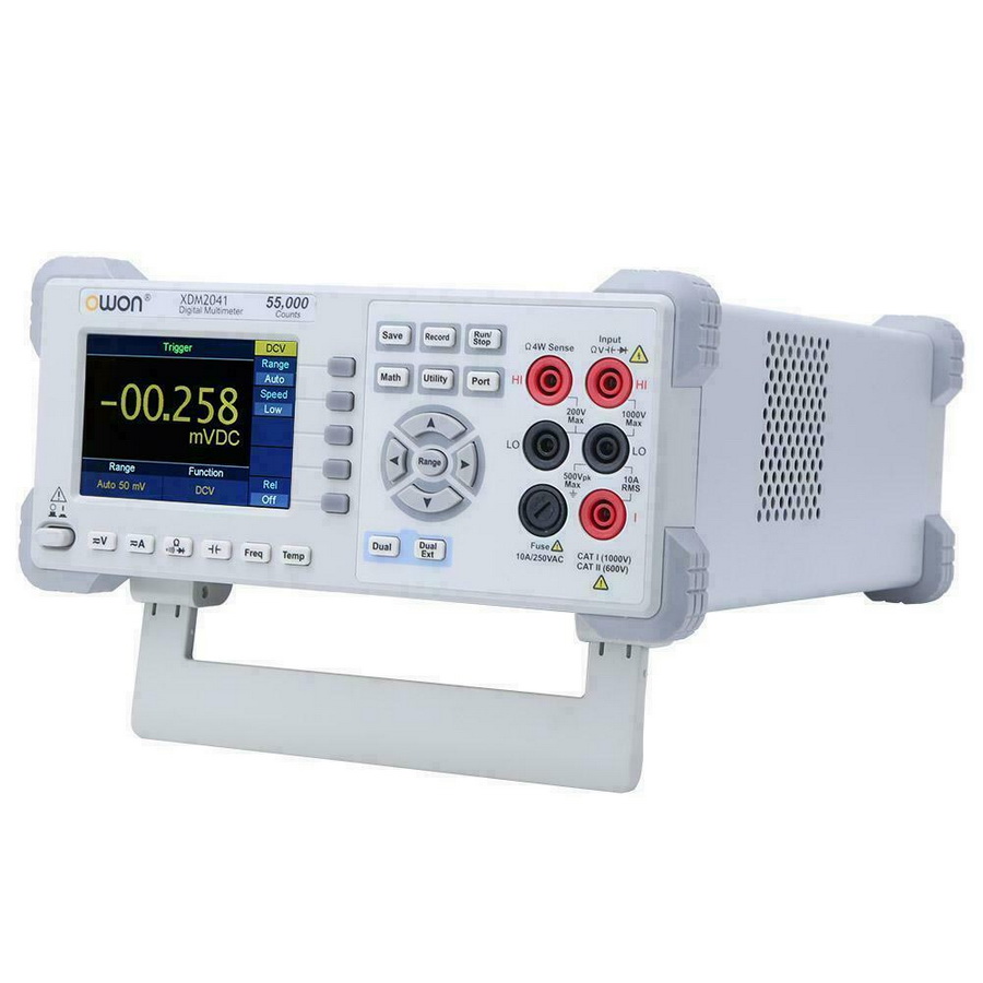 XDM2041 - цифровой настольный мультиметр OWON предназначен для измерения напряжения AC/DC, тока AC/DC, сопротивления, ёмкости, частоты/периода, температуры, проведения тестирования диодов и проверки на проводимость. Измерение сопротивления выполняется как по 2-х проводной, так и 4-х проводной схеме исключающей сопротивление пробников. Мультиметр OWON XDM2041 имеет разрядность 4½ , количество отсчетов 55000 и обладает высоким быстродействием, обеспечивающим 65 измерений в секунду. Для корректного измерения переменного тока и напряжения реализована функция измерения истинного среднеквадратичного значения (TrueRMS).