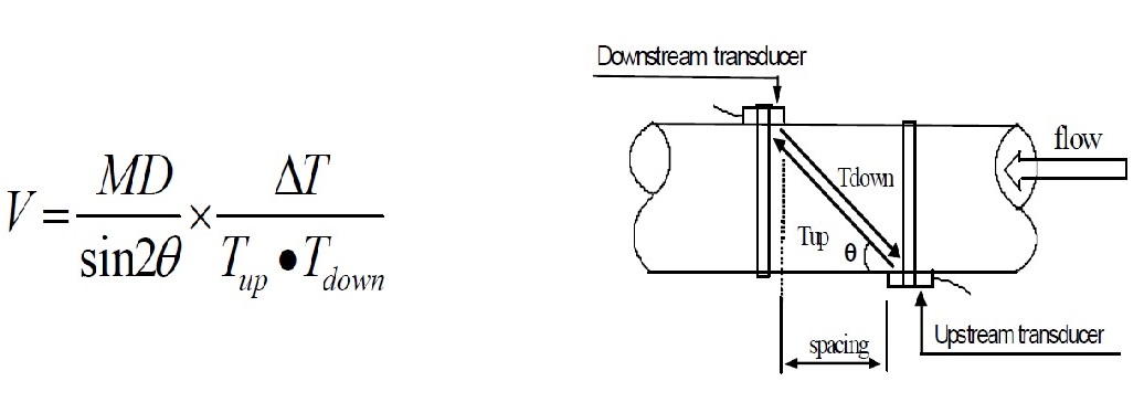 Таким образом, скорость распространения акустического сигнала, поочерёдно генерируемого обоими преобразователями, увеличивается, когда сигнал направлен по потоку, и уменьшается, когда направлен против потока.
