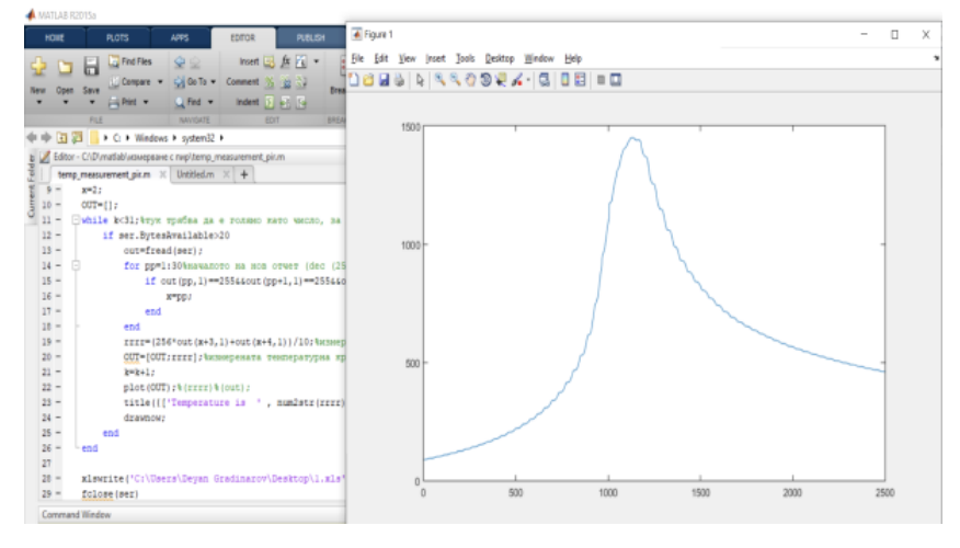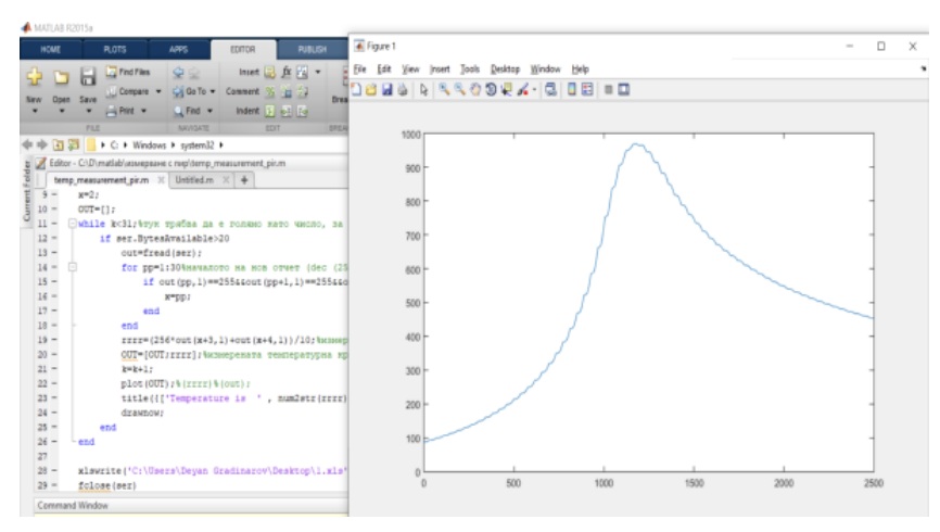 Для проведения эксперимента были выбраны два пирометра: Trotec TP10 и IL 92. Оба имеют широкий диапазон измерения температур, включая жидкие металлы. Превосходное соотношение расстояния к размеру измеряемой поверхности, равное 75:1 (Trotec TP10) и 50:1 (IL 92), позволяет проводить измерения на больших расстояниях даже для небольших объектов, а также в экстремальных условиях, например, в печи. Характеристики прибора: Trotec TP10 – диапазон измерения: от -50 до 1850°С; точность прибора ± 2%; время реакции – 150 мс; спектральный диапазон – 8–14 мкм[5]; IL 92 – диапазон измерения: от -50 до 2200°С; точность прибора ± 2%; время реакции – 150 мс; спектральный диапазон – 8–14 мкм[6]. Пирометры запускаются в режиме непрерывного измерения и подключаются к компьютеру через USB-порт. Их выходные сигналы считываются программой, разработанной на Matlab. Один отчёт пирометра представляет собой пакет из 17 байт: два начальных FF, следующие два байта представляют текущую измеренную температуру с точностью 0,1°C, последний – завершающий байт – AA. Время измерения задаётся заранее путём установки входного буфера (байт), кратного 17. После завершения процесса результаты автоматически переводятся в температуру (градусы Цельсия), строится график, данные сохраняются в файле .xls, а график – в .jpeg.