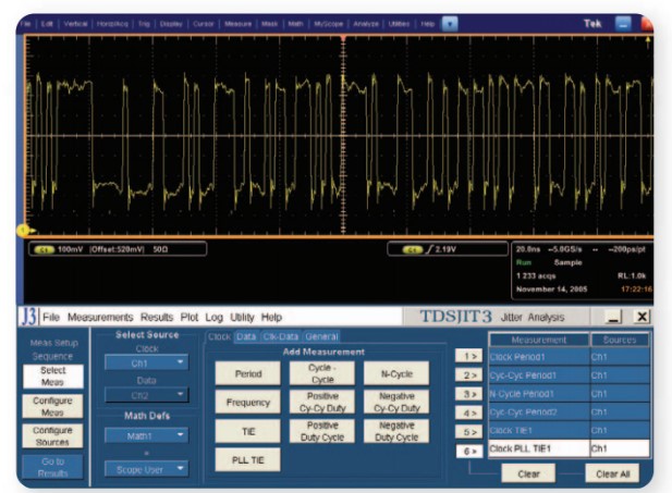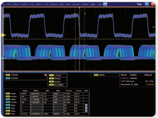 Рис.16 С помощью приложения TDSJIT3 для исследования сложных сигналов, работающего на осциллографе DPO7000, можно быстро выполнять тонкие измерения с анализом нестабильности фронтов при разработке устройств.