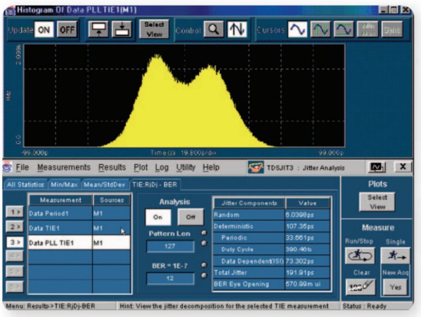 Рис.17 Осциллограф DPO7000 с приложением TDSJIT3 для анализа нестабильности фронтов обеспечивает измерение суммарной нестабильности фронтов сигнала данных, приблизительно равной 192 пс (Tj = Dj + 2Q(BER) * Rj), где Q(10E-12) = 7. На гистограмме измерений ошибки временного интервала схемы ФАПЧ представлено в графическом виде статистическое распределение данных сигнала.