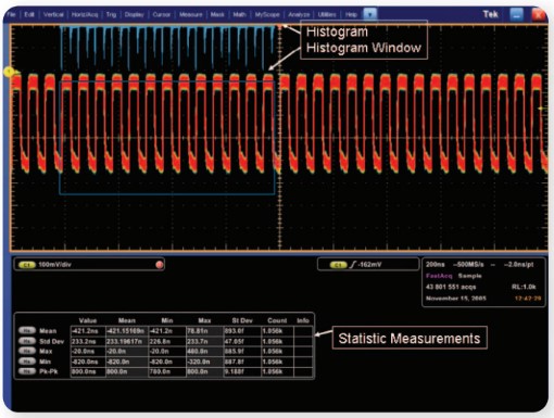 Цифровые осциллографы позволяют также производить статистическую оценку таких измерений как нестабильность фронтов или метастабильность. При отладке используются следующие типичные статистические измерения: