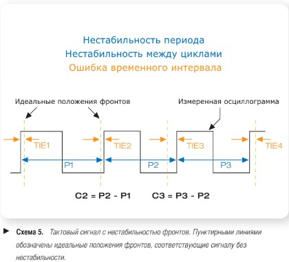 На схеме 5 изображен тактовый сигнал с временной нестабильностью. Пунктирными линиями обозначены идеальные положения фронтов, соответствующие сигналу без нестабильности.