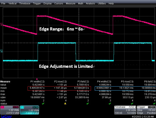 3. При генерировании импульсной формы сигнала частотой 0,1 Гц, технология EasyPulse позволяет устанавливать время нарастания/спада фронтов импульса в большом диапазоне( от 6 нс до 6 с). Регулировка фронтов импульса DDS при данной частоте - ограничена.