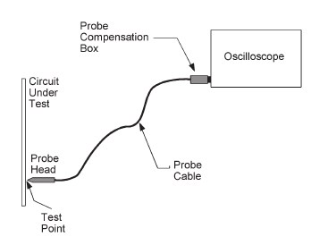Схема под тестированием, головка пробника, точка тестирования, кабель пробника, устройство компенсации, осциллограф