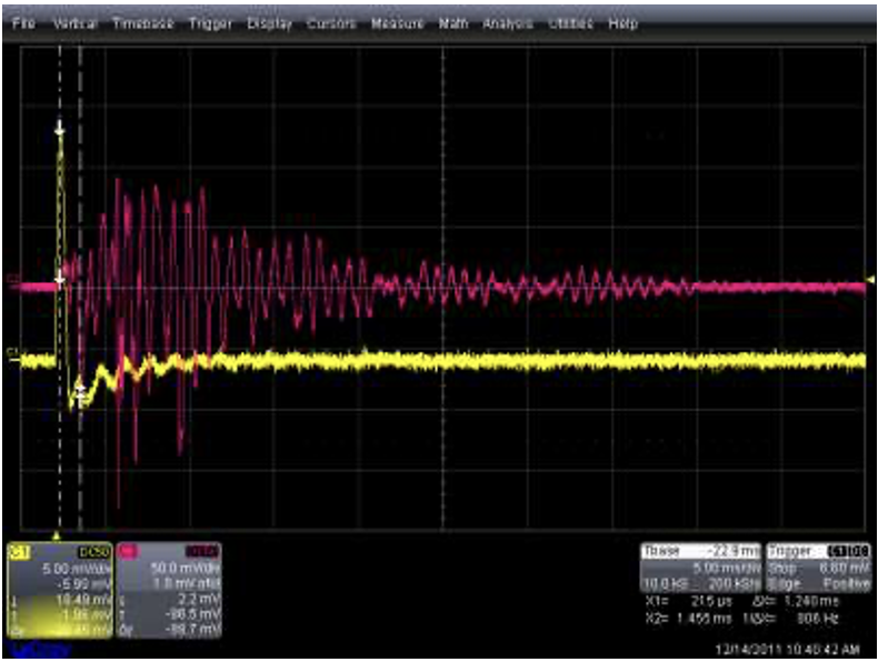 Канал 2 показывает выходной сигнал другого датчика (акселерометра), расположенного примерно в 1 м от исходной точки удара. В этой точке исходный короткий, резкий импульс был преобразован в звон с меньшей амплитудой, но гораздо более продолжительный. Используя только визуальные инструменты, инженер может разместить курсоры на двух формах сигнала, чтобы измерить задержку времени между исходным ударом и первым существенным пиком переданного звона.