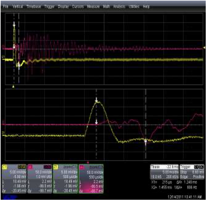 Красный блок в правом нижнем углу рисунка показывает показания курсоров. В этом примере высокий пик на канале 1 находится на 215 мкс (измерено относительно времени срабатывания осциллографа), а первый большой отрицательный пик на канале 2 находится на 1,455 мс. Это дает «дельта t» 1,240 мс между событиями на двух датчиках. Инженер может получить лучший обзор — и более точное измерение — используя самый простой инструмент просмотра в цифровом осциллографе — функцию масштабирования.