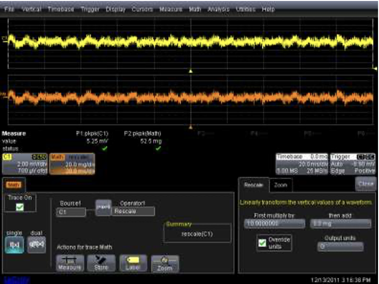 Датчики преобразуют обнаружение активности «реального мира» (изменение температуры, ускорение и т. д.) в электрический сигнал. Чтобы лучше понять, что говорит датчик, часто бывает полезно преобразовать сигнал, обычно в вольтах, в реальные единицы измерения, которые описывают то, что обнаружил датчик. Это простое математическое уравнение y = mx+b, где x — показания датчика в вольтах, m — коэффициент перевода в реальные единицы измерения, а b — любое смещение, которое присутствует. Результат этого расчета, y, — это число, которое описывает то, что происходит в реальном мире. Например, если акселерометр, используемый в предыдущих примерах, имеет выходной сигнал один вольт на 10 G ускорения, преобразование из «вольт» в «G» будет y = 10x. Простая математическая функция, преобразующая формы сигналов напряжения датчика в физические единицы, называется «перемасштабированием». Форма сигнала напряжения перемасштабируется в единицы, имеющие прямой физический смысл. На рисунке 4 показан пример. Верхний след — это форма сигнала напряжения с выхода датчика. Это акселерометр, прикрепленный к корпусу вентилятора. Нижняя форма сигнала имеет точно такую же форму, но все числа в этой форме сигнала в десять раз больше, а единицы измерения второй формы сигнала указаны в «гравитации», а не в «вольтах». Мера амплитуды от пика до пика верхней формы сигнала составляет 5,25 милливольт.