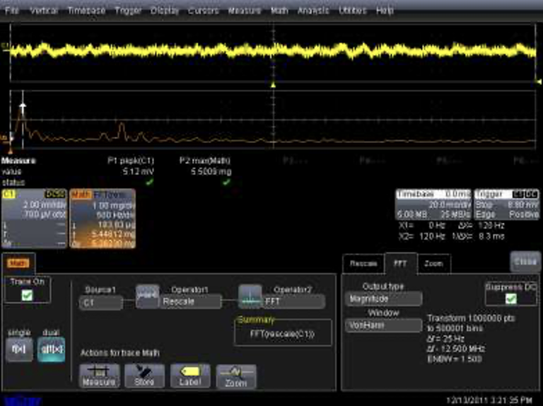 Другим распространенным типом математического анализа является рассмотрение частотной области показаний датчика. Это особенно верно, если датчик показывает какую-то повторяющуюся структуру в значении своих показаний или если пользователь подозревает, что есть какой-то источник шума, мешающий работе датчика. В этом случае БПФ сигнала датчика может дать указание на источник шума. В случае сигналов акселерометра, показанных на рисунках 1-3, пользователю осциллографа может быть интересно узнать частотный спектр звона. Поведение звона будет различным для разных типов связи (т. е. защитных материалов) между точкой воздействия импульса и датчиком. Если бы мы выполнили БПФ примера, показанного на рисунке 4, частотные спектры дали бы представление о физическом сотрясении вентилятора. На рисунке 6 показана настройка этого типа частотного анализа с использованием того же сигнала, что был показан на рисунке 4. Канал 1 осциллографа захватывает выход датчика, прикрепленного к корпусу вентилятора. Это верхняя трасса. Математическая настройка показывает изменение масштаба, а затем БПФ. Целью перемасштабирования является вычисление параметра P2 - "макс" пере-масштабированной математической трассы.