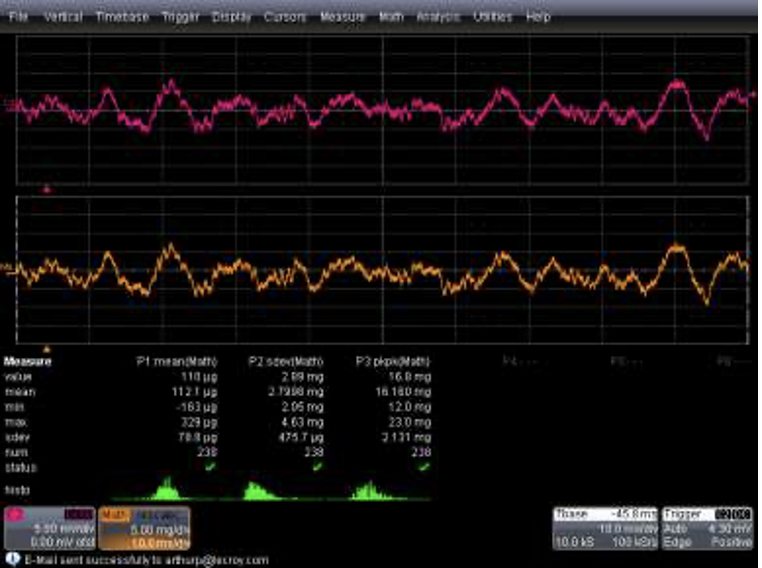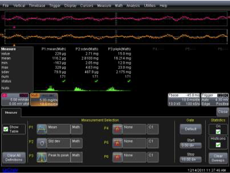 Рисунок 8: Верхняя трасса — это сигнал напряжения с датчика. Ниже — пере-масштабированная трасса с использованием физических единиц. Параметры «mean», «sdev» и «pkpk» вычисляются на пере-масштабированной трассе. Статистика параметров является результатом 238 захватов сигнала. Зеленые фигуры под статистикой показывают форму распределения измерений параметров