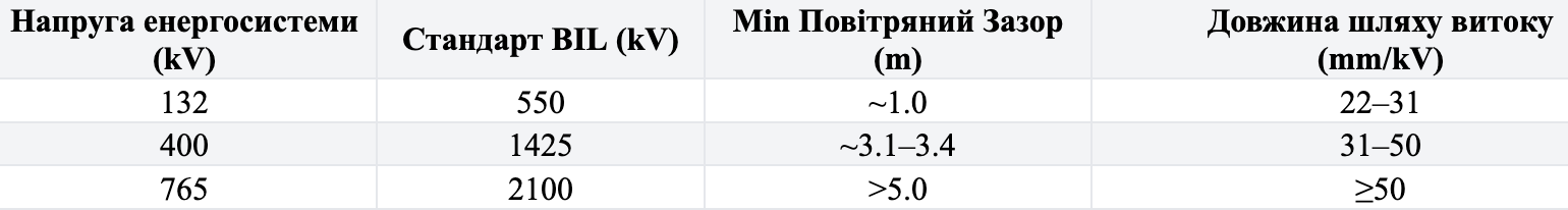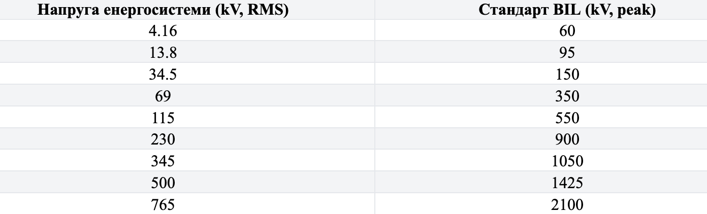 Для обеспечения единообразия МЭК и IEEE определяют стандартизированные значения BIL, соответствующие номинальным напряжениям системы. Эти стандартизированные значения BIL представляют собой округлённые значения, выбранные для согласования с требованиями к разрядникам для защиты от перенапряжений и физическим зазорам. Упрощённая выдержка из стандарта IEEE (C62.82.1) представлена в таблице 1.