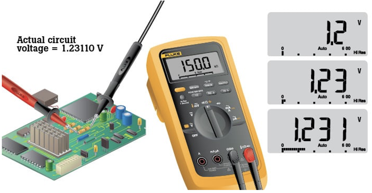 Представьте себе простой тест бытовой батареи питания1,5 В. Если цифровой мультиметр с разрешением 1 мВ в диапазоне 3 В, то при считывании напряжения можно лицезреть изменение на 1 мВ. Пользователь имеет возможность увидеть изменения показаний всего в одну тысячную вольта или 0,001 в диапазоне 3 В.